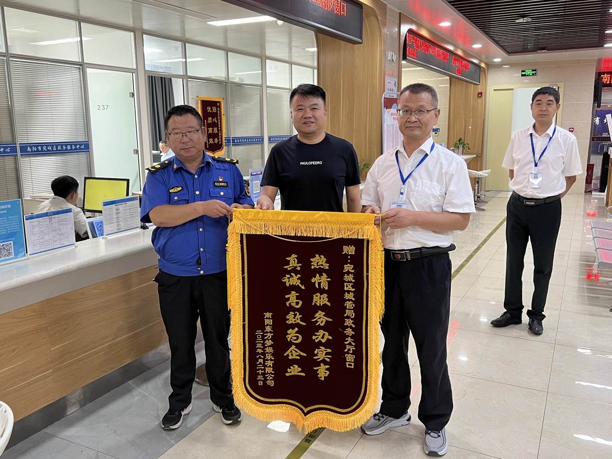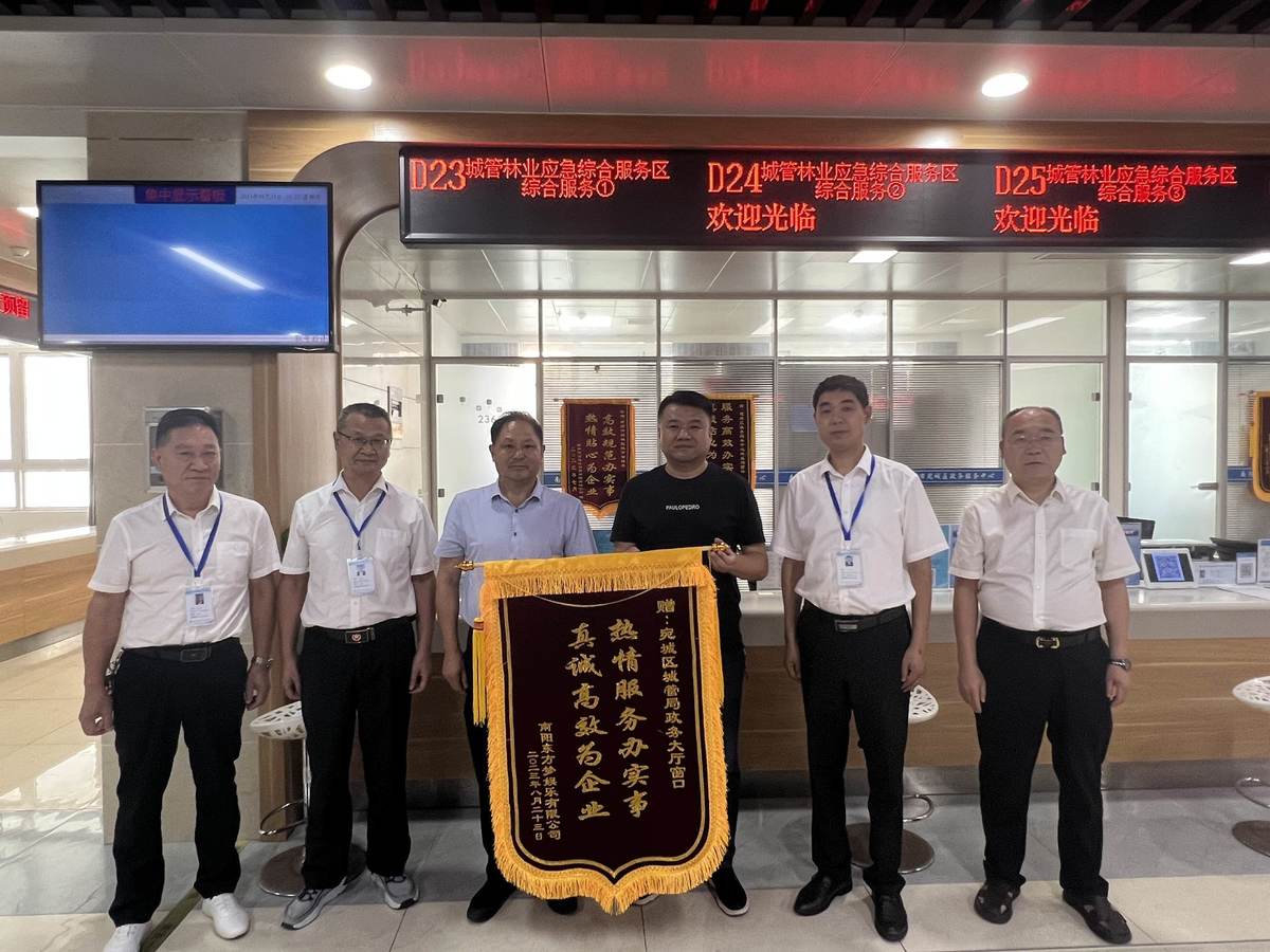 8月24日上午,宛城区政务服务大厅城市管理窗口收到了南阳东方梦娱乐有限公司送来的“热情服务办实事 真诚高效为企业”的锦旗,对城市管理窗口为企业办理城镇排水许可证时的耐心、细致服务表示感谢。