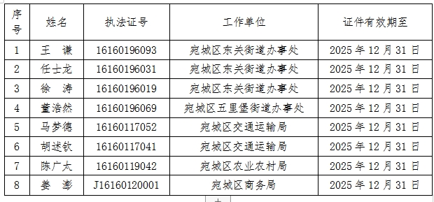 自本公告公示之日起,凡持上述编号的证件进行行政执法活动或进行其他公务活动的,均为冒充的行政执法人员。公民、法人和其他组织可拒绝检查并向我单位举报(举报电话:0377-62263558)