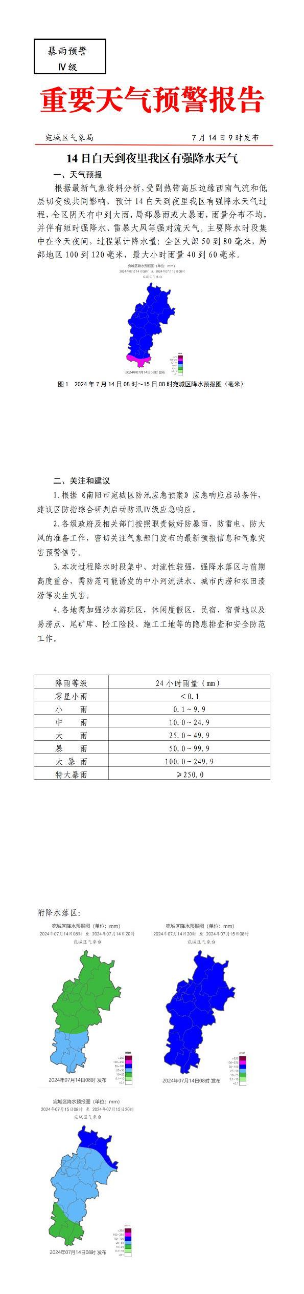 宛城区重要天气预警报告20240714-暴雨Ⅳ级