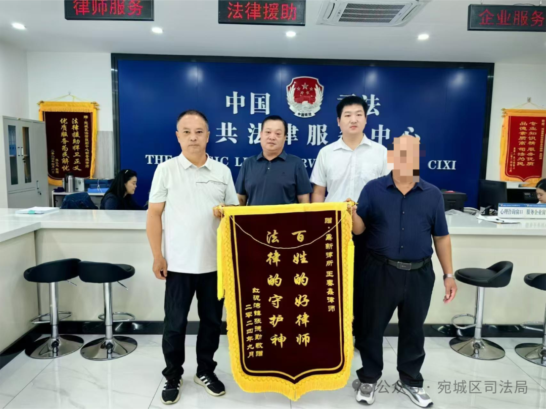 9月13日,受援人张某的儿子王某将印有“百姓的好律师 法律的守护神”的锦旗送到南阳市宛城区法律援助中心,以感谢宛城区法律援助中心及援助律师为其母亲解决了因交通事故受伤后的索赔问题。