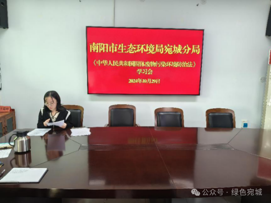 为深入打好净土保卫战,防治固体废物污染环境,保障公众健康,维护生态安全,进一步提升宛城分局干部职工对固体废物污染防治工作的认识,增强依法治污的能力,2024年10月29日,南阳市生态环境局宛城分局组织召开《中华人民共和国固体废物污染环境防治法》学习,会上有宛城分局污防科相关人员讲解《中华人民共和国固体废物污染环境防治法》重要性。