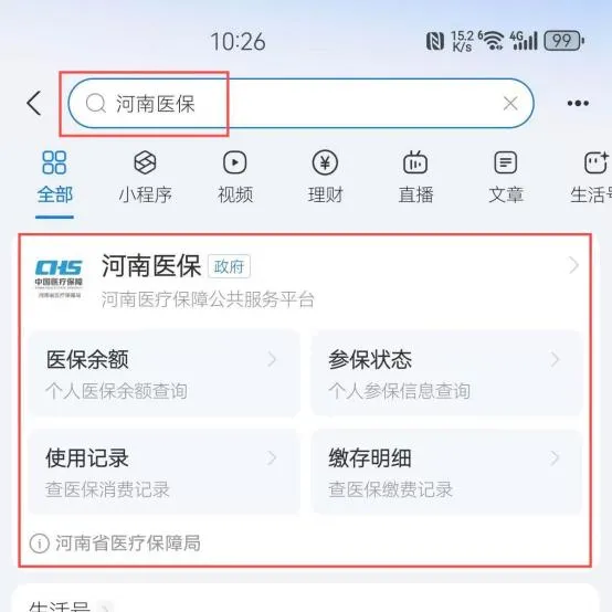 1.手机打开支付宝,搜索并进入“河南医保 ”小程序。