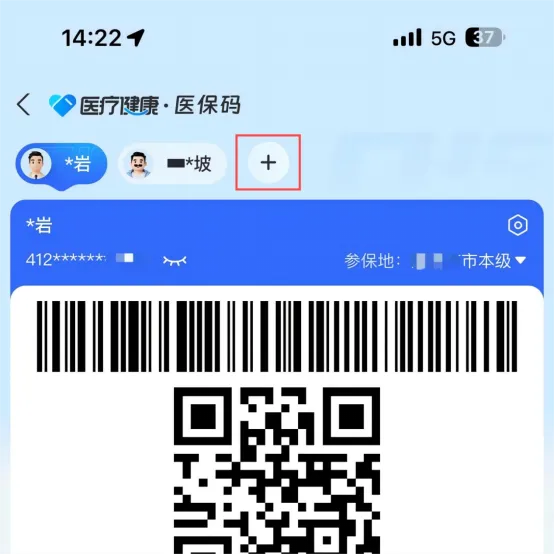 1.已经激活本人医保码的参保人,打开支付宝进入医保码二维码界面,点击个人头像旁边的“+”号。