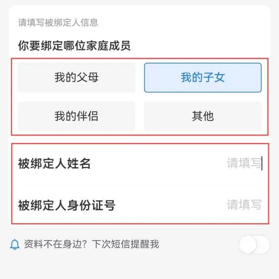 3 .按需要选择和填写被绑定人的信息,勾选协议并点击下一步。
