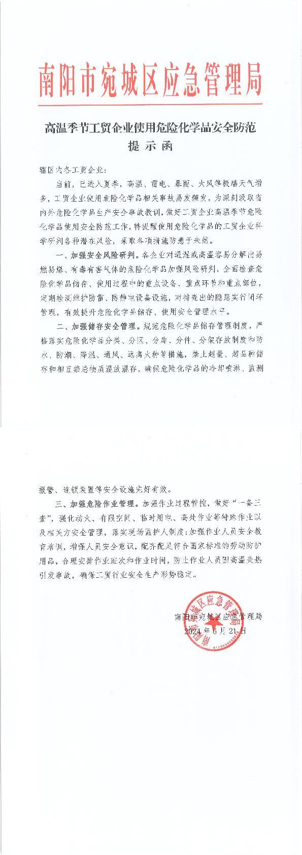 高温季节工贸企业使用危险化学品安全防范提示函