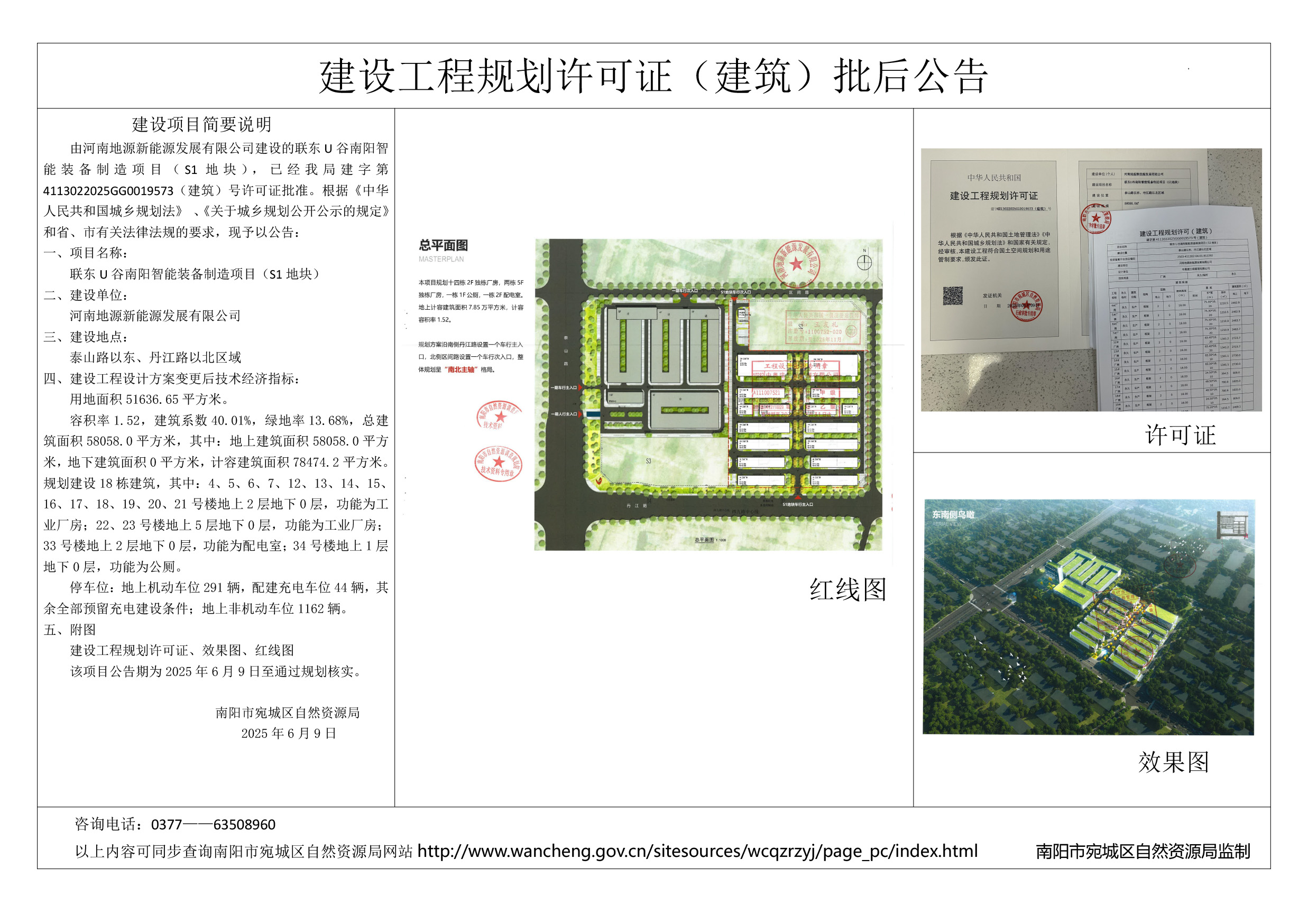 联东U谷南阳智能装备制造项目(S1地块)建设工程规划许可证(建筑)批后公告
