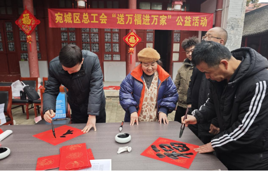1月26日,宛城区总工会、区文联组织书法家举办的“送福进万家”公益活动在区政府小广场上开展,为广大职工群众送福送春联。