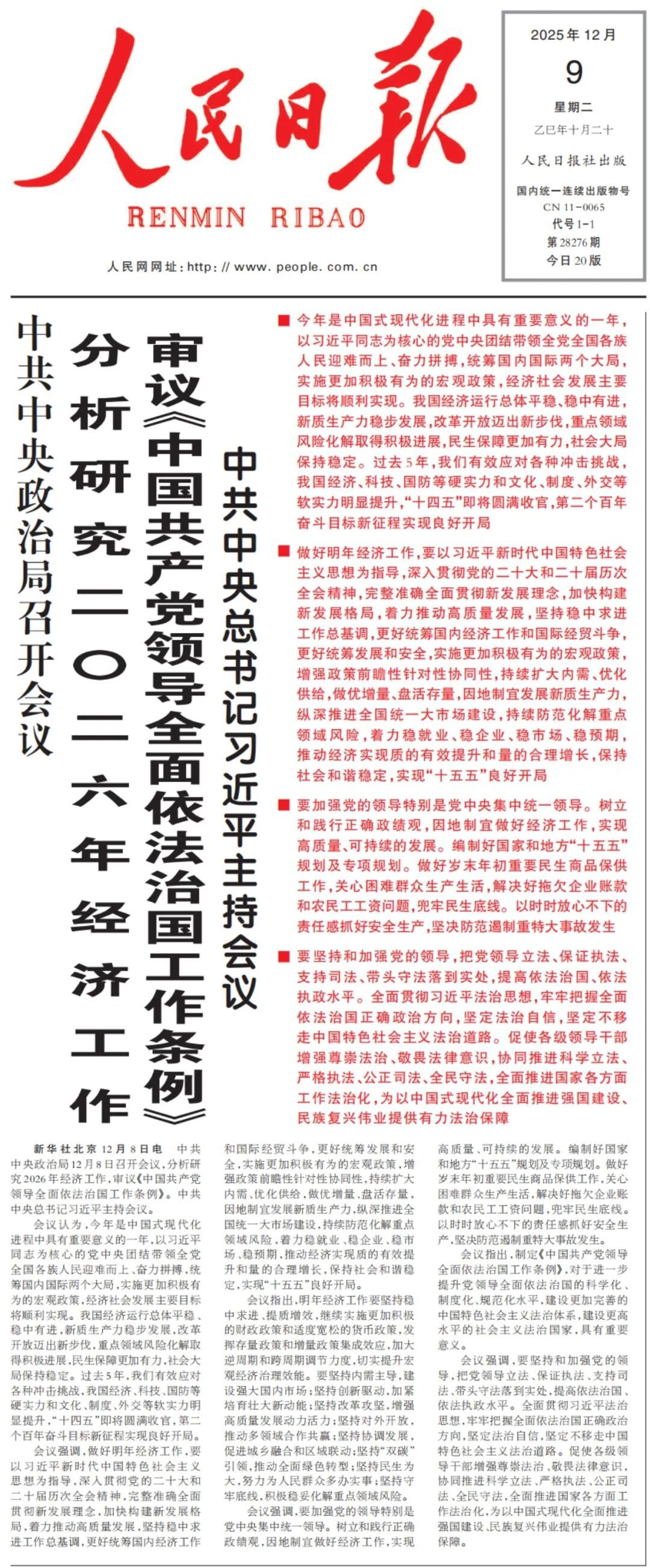 中共中央政治局2025年12月8日召开会议,审议《中国共产党领导全面依法治国工作条例》(以下简称《条例》)。会议强调,要坚持和加强党的领导,把党领导立法、保证执法、支持司法、带头守法落到实处,提高依法治国、依法执政水平。全面贯彻习近平法治思想,牢牢把握全面依法治国正确政治方向,坚定法治自信,坚定不移走中国特色社会主义法治道路。促使各级领导干部增强尊崇法治、敬畏法律意识,协同推进科学立法、严格执法、公正司法、全民守法,全面推进国家各方面工作法治化,为以中国式现代化全面推进强国建设、民族复兴伟业提供有力法治保障。