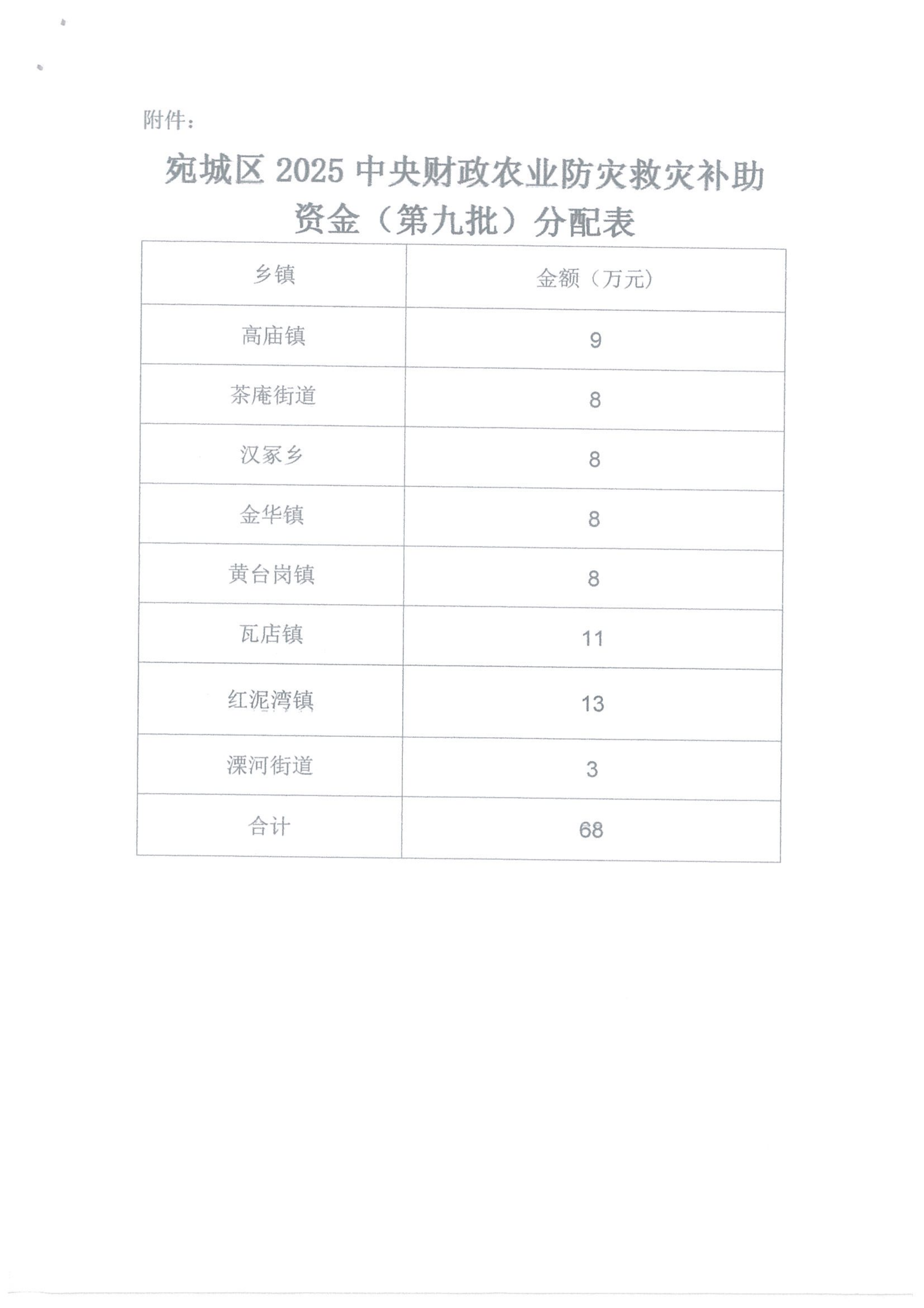 关于宛城区2025年中央财政农业防灾救灾补助资金(第九批)的分配方案