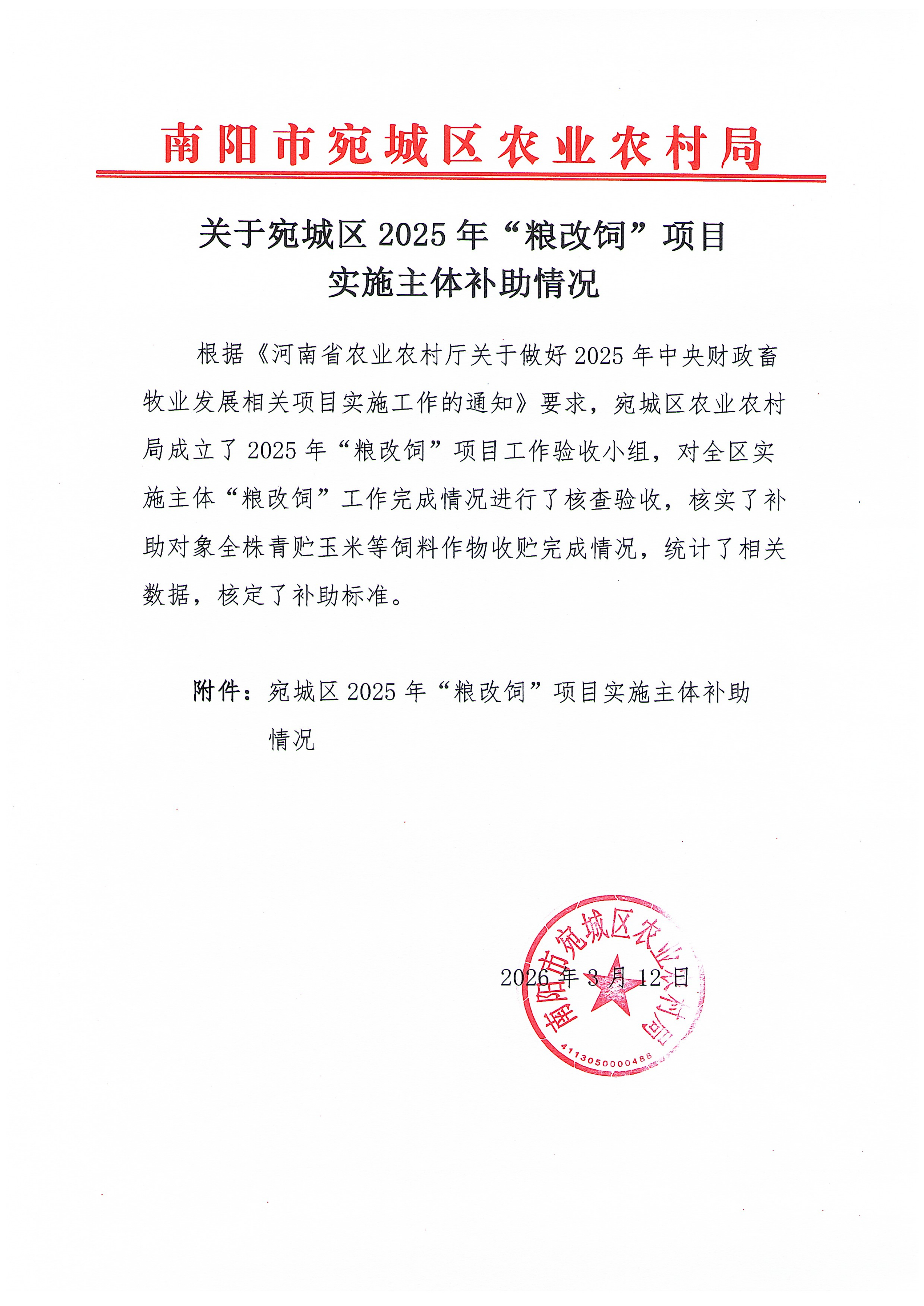 关于宛城区2025年“粮改饲”项目实施主体补助情况