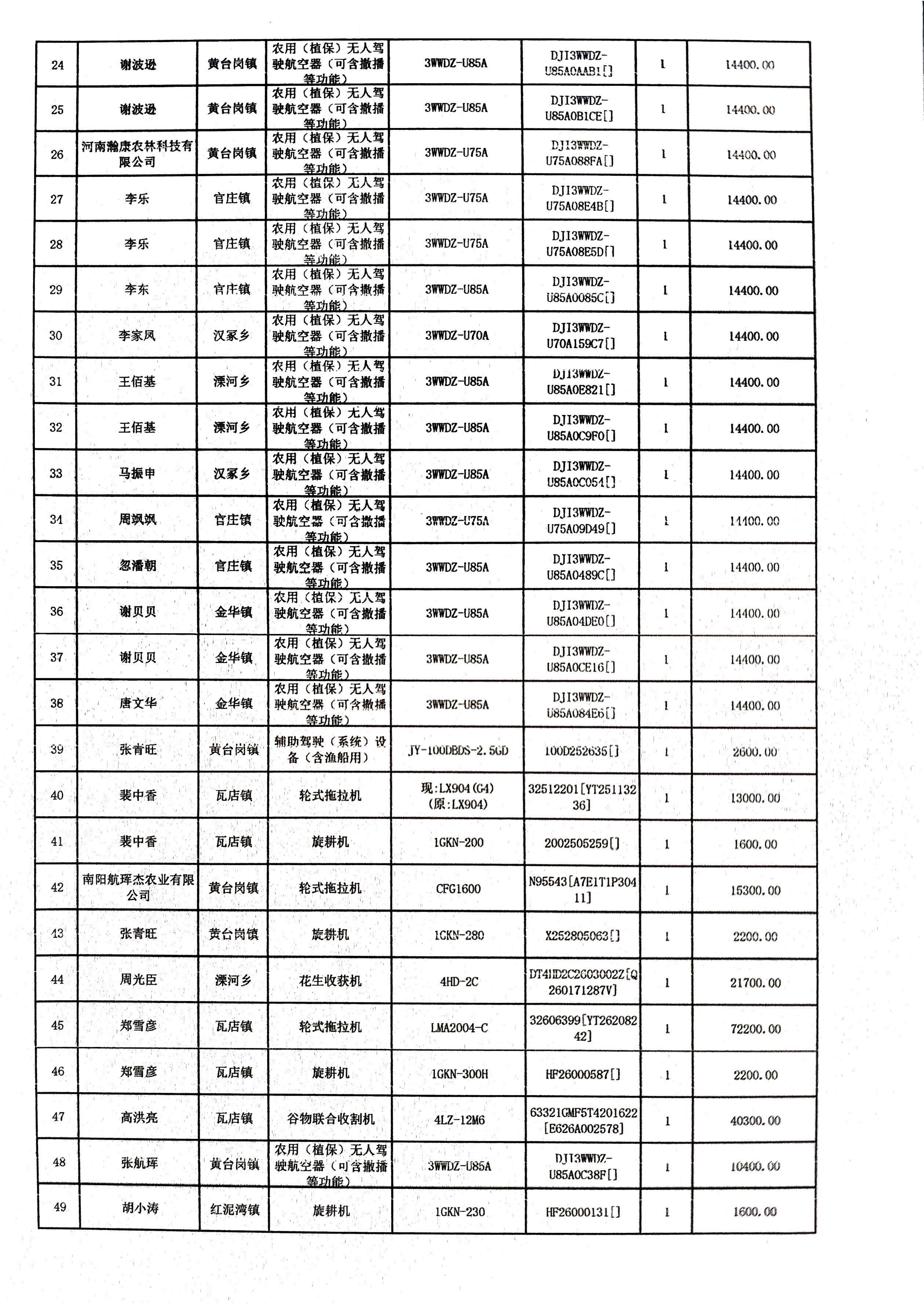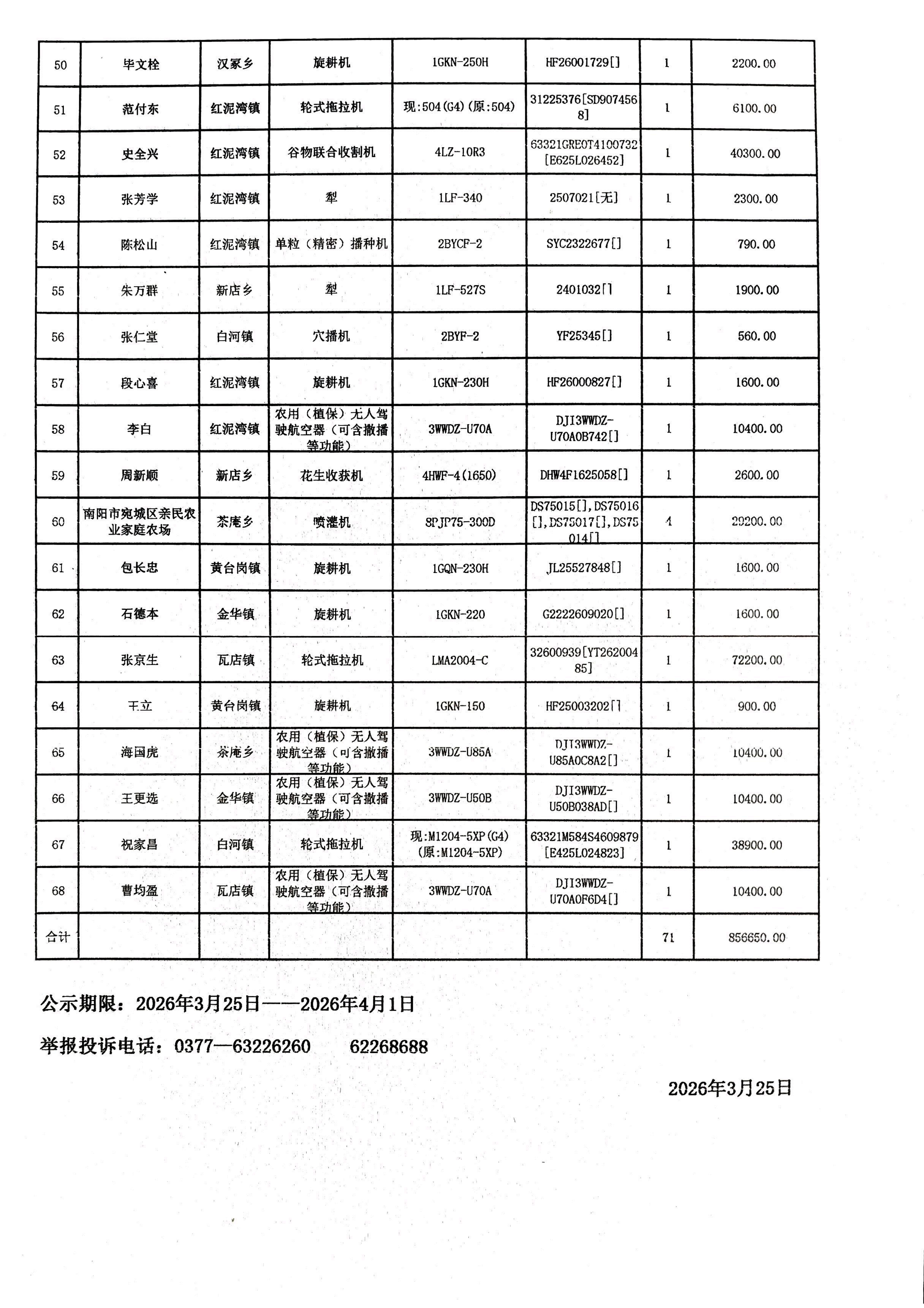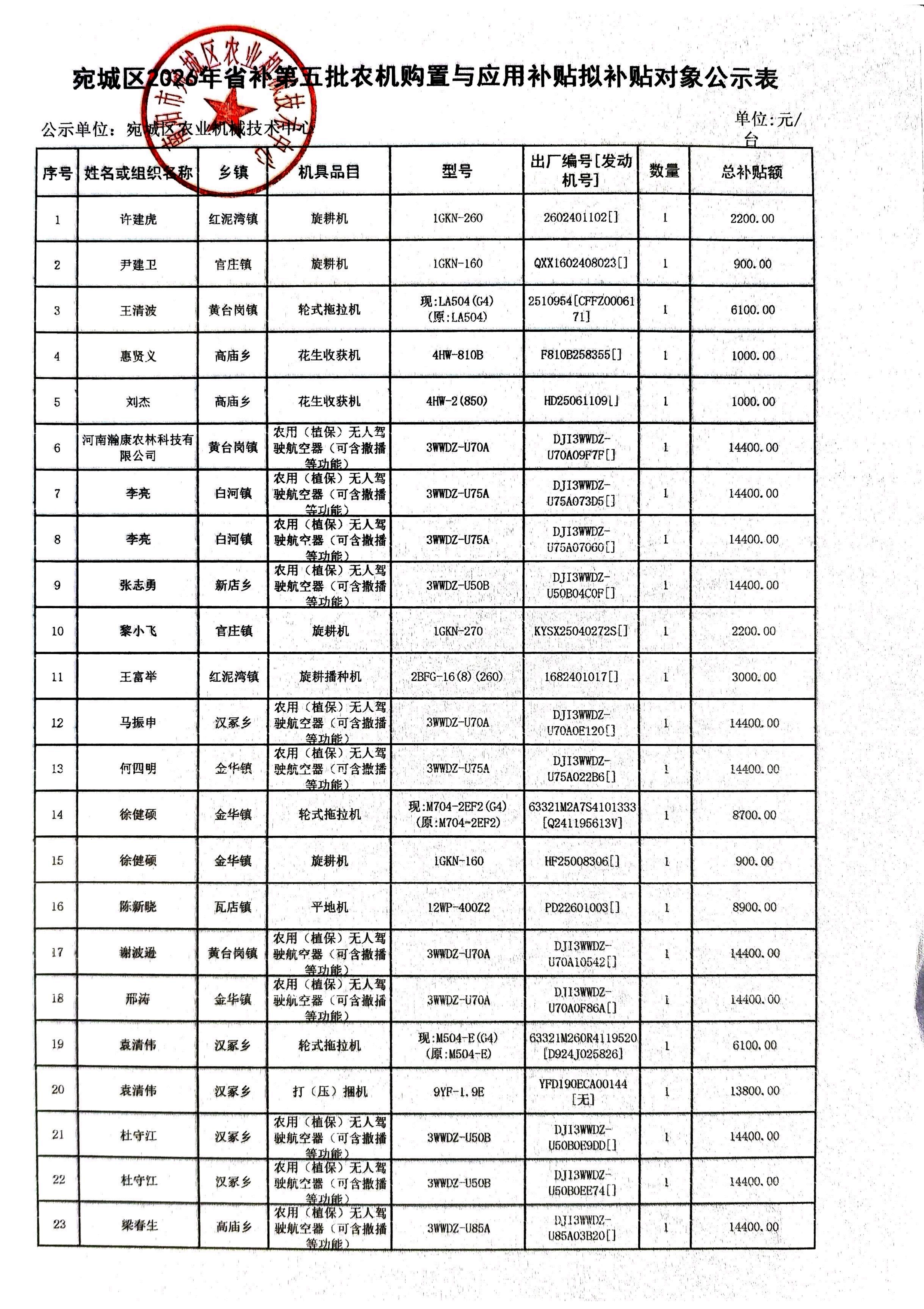 宛城区2026年省补第五批农机购置与应用补贴拟补贴对象公示表