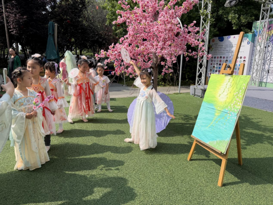 活动还设置了古诗词舞蹈教学环节。孩子们手持团扇,伴着经典诗词翩跹起舞,在诗、舞、礼的融合中感受传统审美意趣。随后的汉服走秀将活动推向高潮,孩子们身着汉服自信展示,赢得家长阵阵掌声。最后,孩子们提笔写下自己喜欢的古诗或文化传承心愿,并在合影中定格这一美好时刻。